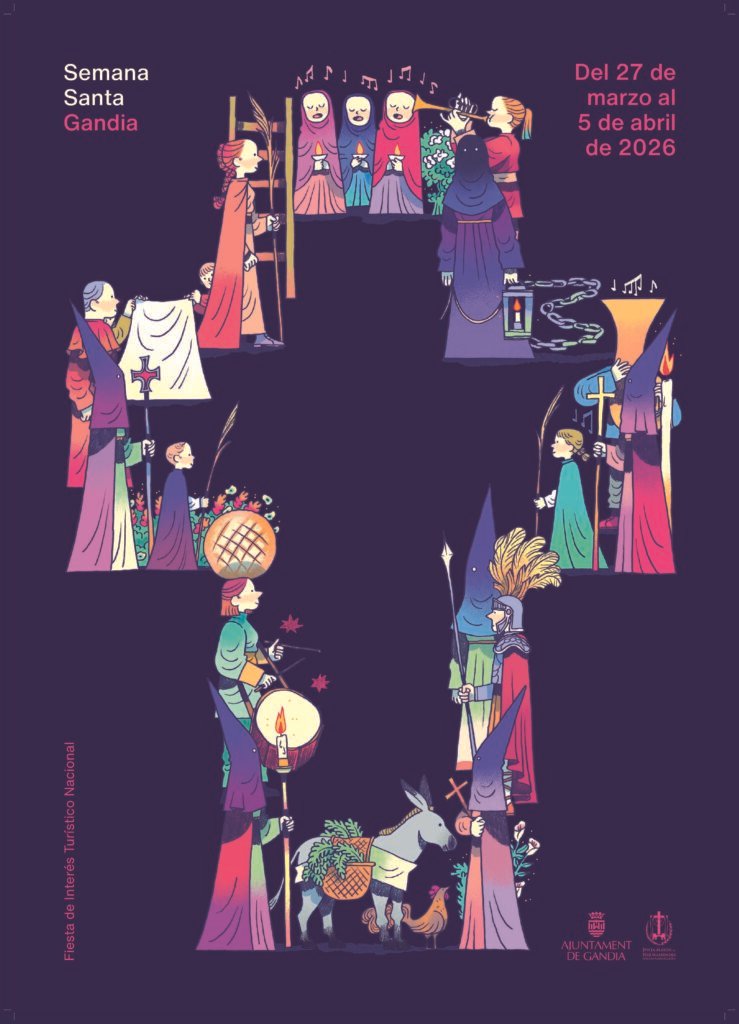 El cartel, obra de *Núria Tamarit* y *Santi Vicente*, propone una mirada contemporánea, inclusiva y diversa de la Semana Santa de Gandía, Fiesta de Interés Turístico Nacional, en la que se sientan identificadas tanto las personas que participan activamente en los distintos actos como la ciudadanía de Gandia y quienes desean conocerla y disfrutarla.